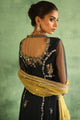 Hand embellished sparkly details on a black silk ensemble complimented with a tulle pre-draped dupatta with mirror work and crushed silk dhaka pants.